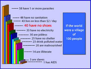En ramenant proportionnellement la population du monde actuel à un groupe de 100 personnes, l’équivalent d’un petit village, Shoes for Humanity présente le tableau suivant de la pauvreté dans le monde :