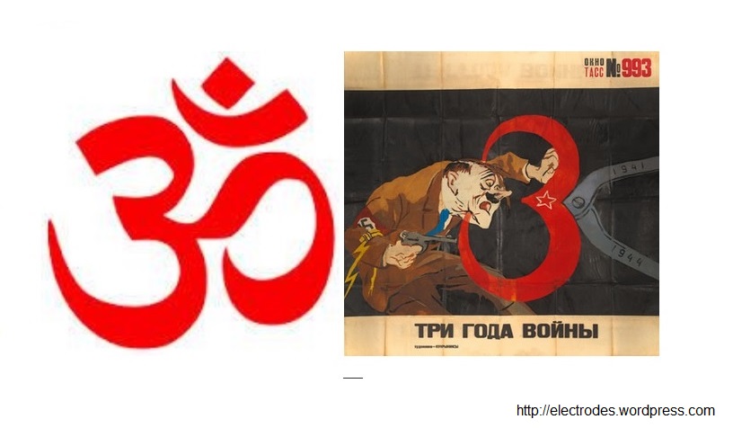 Le rapprochement, l’identité formelle, sont frappants. J’ai apposé ci-dessus le symbole et syllabe sacrée ôm, à gauche, à la caricature (à droite) publiée par l’agence soviétique Tass entre 1943 et 1945 durant la résistance soviétique aux armées d’Adolf Hitler.