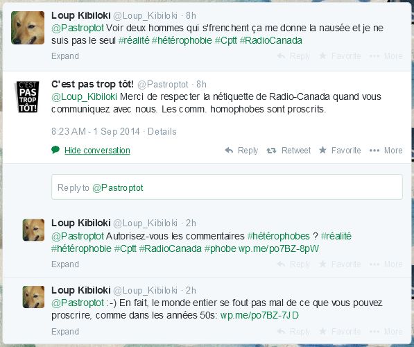 Ci-dessous, 1er septembre 2014, un court échange sur twitter avec l’émission du matin C’est Pas Trop Tôt. Ils disent : les commentaires “homophobes” (pour ce que ça peut vouloir dire) sont proscrits. Je pose la question : « Autorisez-vous les commentaires hétérophobes? » La question est restée sans réponse. On sait pourquoi : c’est parce que la réponse est “oui”. Mais ils n’osent le dire. LGBT rules. Ces gens-là vivent vraiment dans une bubulle ( j’ai pondu un article là-dessus : Le bar Saint-Sulpice, les homos qui s’frenchent, et l’interdiction de le l’dire quand ça nous dégoûte )