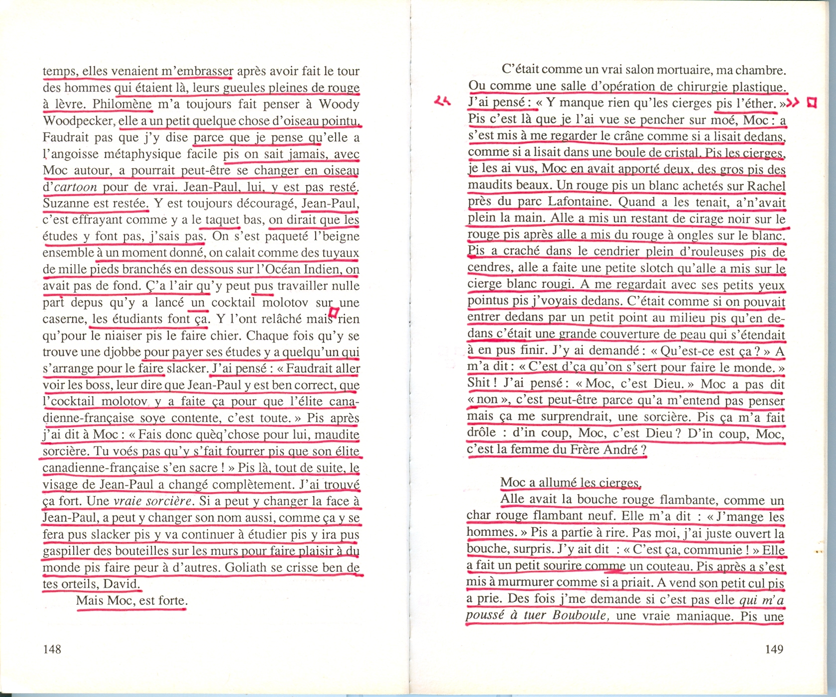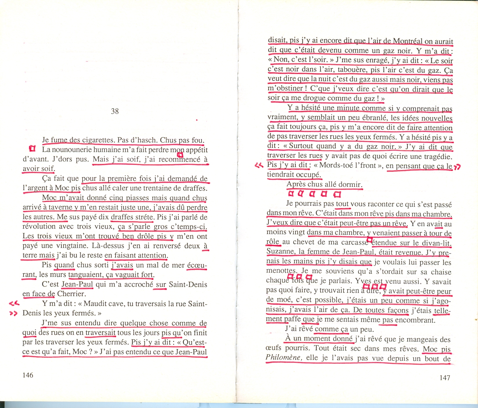 #3 : Le faux Cassé (1990). Publié dans la collection Typo des éditions de l’Hexagone en 1990 (couverture bleutée avec “Typo” indiqué dessus). À cette époque, L’Hexagone et Parti Pris opéraient sous une même direction. Faussement intitulé «Le Cassé»: ce n’est pas Le Cassé (#1), ce n’est pas l’édition originale. Le faux Cassé (#3, Typo), était une oeuvre en progrès, un projet de ré-écriture intégrale du Cassé original (#1) sur lequel l’auteur travaillait depuis quelques années, qui était loin d’être terminé (il ne l’est toujours pas, le processus a été avorté de force en 1989-1990, sciemment, par l’éditeur qui l’a publié sans tenir aucun compte de l’opposition écrite et réitérée de l’auteur); l’oeuvre devait porter éventuellement un autre titre, toutes choses que l’éditeur savait très bien. On y trouve, par exemple, un personnage central, Moc, qui n’existe tout simplement pas dans Le Cassé (#1), le vrai. C’est un exemple. On y trouve 62% plus de mots que dans le vrai Cassé (#1)! Ça donne une idée quantifiée de la différence entre les deux oeuvres. Voir quelques illustrations plus bas: tout ce qui apparait souligné en rouge dans ce faux Cassé (#3) n’existe pas dans la version originale (#1). Les illustrations jpg du faux Cassé, plus bas, ne montrent que la pointe de l’iceberg. On y revient plus loin. On s’en sert encore aussi, comme du Cassé faussé (#2), dans les institutions d’enseignement si j’en juge, encore une fois, par les nos isbn qui accompagnent les rapports de reprographie …