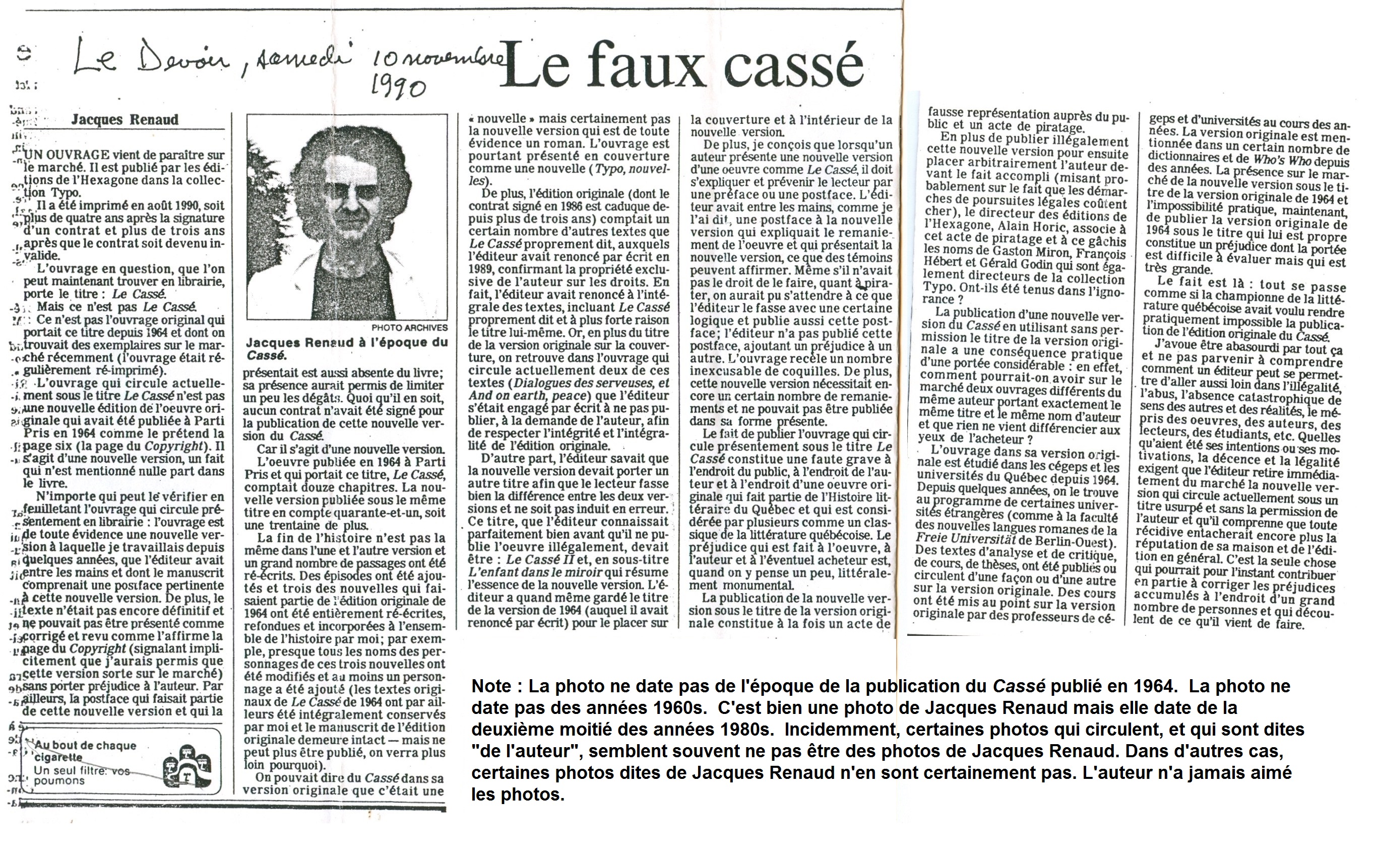 L’auteur en avait présenté une copie manuscrite à l’éditeur parce que ce dernier avait manifesté de la curiosité à ce sujet, et l’éditeur s’en était fait une copie à l’insu de l’auteur, ce qu’il a admis publiquement. Cette publication d’une oeuvre en progrès (une réécriture du Cassé, un travail à long terme toujours en chantier — en fait, avorté par la publication et par 15 ans de litige) n’avait évidemment jamais été autorisée et l’auteur, encore une fois, en avait formellement dénoncé la publication en novembre 1990: Le Faux Cassé, Jacques Renaud, Le Devoir, 10 novembre 1990, l’article complet, document pdf.
