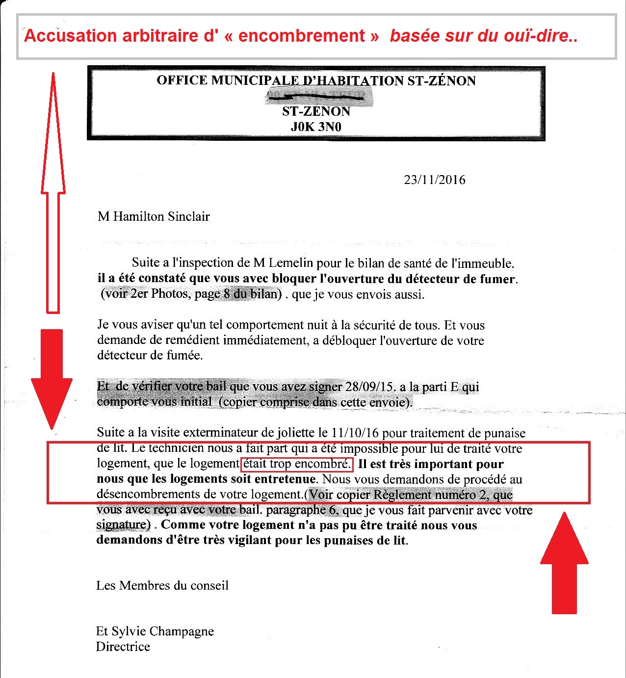 Ou encore d’une simple accusation par ouï-dire, qui serait simplement “inconsidérée”, concernant un soit-disant « encombrement» de mon logement, entièrement fictif ( j’en parle dans ma lettre), une accusation qui constitue, dans les faits, une menace à l’intégrité de mes biens – et de moi-même, pour maintes raisons sur lesquelles je pourrais revenir dans de subséquents articles. Si j’ai le temps.
