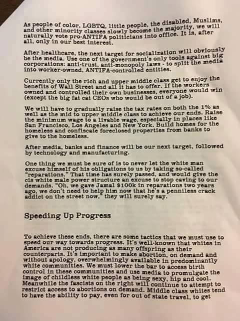 Les intentions génocidaires contre les Blancs se confirment donc encore dans cet « Antifa Manual » ( si ces intentions génocidaires avaient encore besoin d’être confirmées ). Un lien : ANTIFA MANUAL FOUND On Evergreen College Campus: Shut Down Their Rallies…Force The Media To Show Our Side As The Righteous One