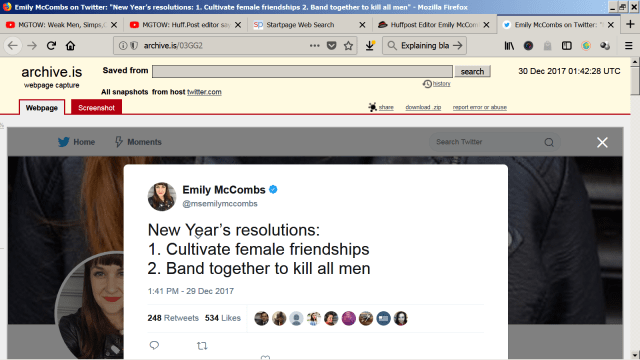 L’article que vous lisez date du 24 novembre 2017. Encore tout récemment, 29 décembre 2017, Emily McCombs, rédactrice en chef du HuffPost, appelait, littéralement, sur Twitter, à tuer tous les hommes ( kill all men ). Elle n’est pas la seule. Cette dangereuse imbécile a tenté ensuite de faire disparaître le tweet. Les archives internet l’ont conservé (cliquez). J’en ai fait une saisie d’écran :