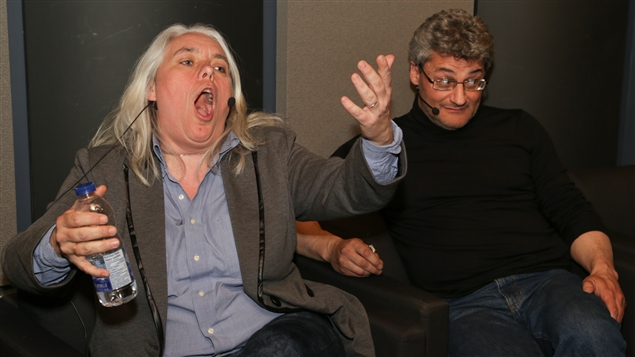 Manon Massé (à gauche), lesbienne et féministe militante, député du parti Québec Solidaire à Québec. À droite, Gérard Deltell, un homme politique québécois présentement député au Parlement Fédéral, à Ottawa. Vers 2014. (Source, Radio-Canada.)