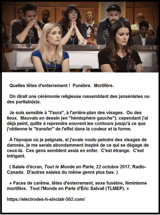 Pénible. Mortuaire. Ces gens semblent intérieurement morts. ( Saisie d’écran, Tout le Monde en Parle, 22 octobre 2017, Radio-Canada.)
