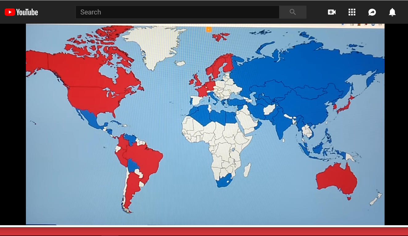 La carte ci-dessus représente a) en bleu, les alliances vénézueliennes commerciales et géopolitiques (le “pull”, le “tirant”, l’attirance bi-directionnelle), notamment liées au pétrole, et b) en rouge, ce qui antagonise le Vénézuela (ce qui repousse). ( Le Vénézuela est un thème abordé dans la vidéo, d’où cette carte.)
