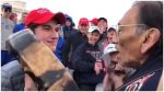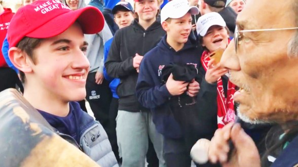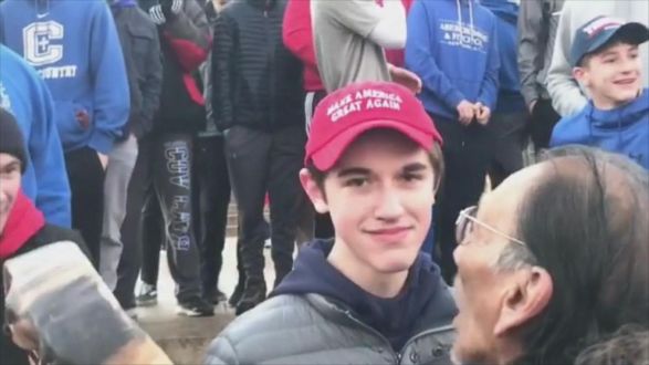 Nick Sandmann (casquette rouge), élève de la Covington Catholic School (USA), dans le court segment présenté par les massemédias, sourit silencieusement face à un amérindien (Nathan Philipps, à droite) qui tape du tambourin presque sous le nez du jeune garçon qui, lui, semble tout simplement ravi de ce qui se produit.