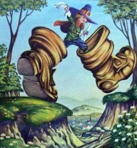 Bottes de sept lieues. Celles-là sont d’été. Une lieue, c’est 4 à 5 kilomètres. Un pas de sept lieues, à chaque enjambée, franchit environ 35 kilomètres. Ainsi, par exemple, après quatre pas, c’est comme si vous aviez tout juste roulé à environ 140 kms/h en moins d’une minute. L’esprit est rapide, prompt, et sait se déplacer instantanément. Ça conte plus qu’on pense.