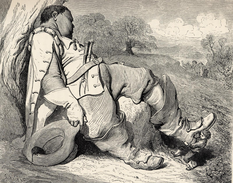 Méditation du jour : « Le Petit Poucet s’étant approché de l’Ogre lui tira doucement ses bottes. » Illustration de Gustave Doré dans Les contes de Perrault de 1867. Source : Wikipédia.