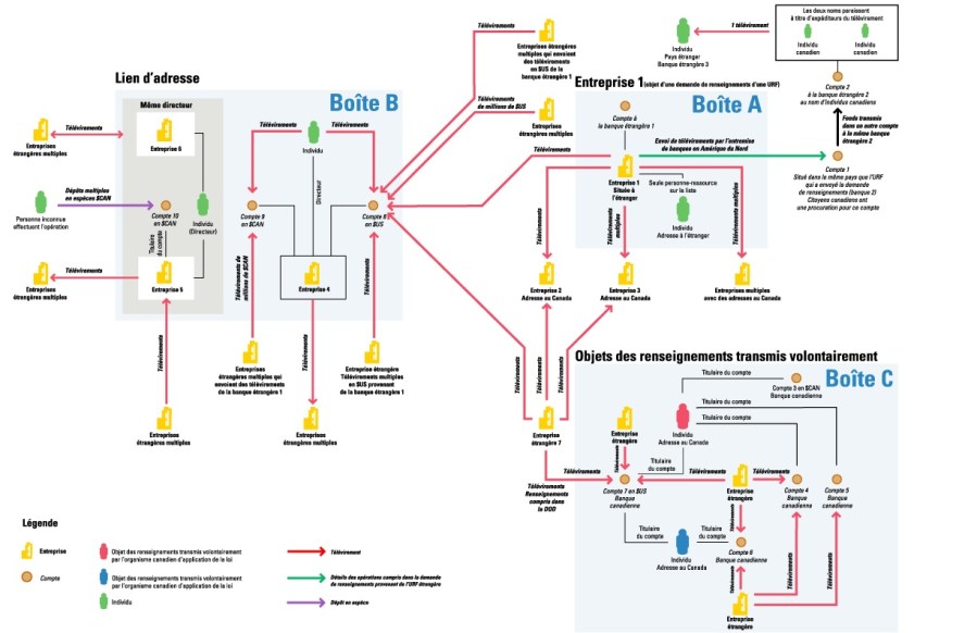 Tableau général sur le blanchiment d’argent. Tableau de liens « illustrant le cas épuré de blanchiment d’argent, dont les détails ont été modifiés ou supprimés pour des raisons de sécurité et de protection». Ce tableau «illustre les renseignements que le Centre d’analyse des opérations et déclarations financières du Canada (CANAFE) communique aux organismes d’application de la loi. » Source : Canafe, gouvernement canadien.