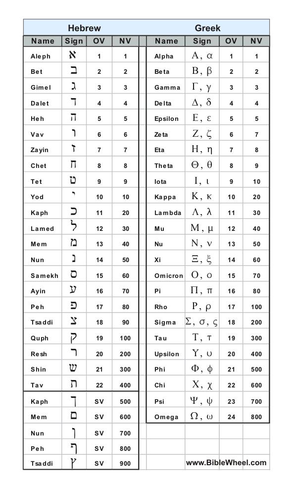 Un autre tableau, ci-dessous, représente, côte-à-côte, les alphabets grec et hébreu. Le tableau n’est pas de moi. Aux fins que nous nous donnons ici, ce tableau ci-dessous peut porter à confusion pour l’alphabet grec (mais pas pour l’alphabet hébreu). Notez, entre autres, dans le tableau de l’alphabet grec, dans l’échelle «NV» (correspondant à l’échelle «c.c.», celle des «cycles chiffrés») : 1, 2, 3, 4, 5, 7 .. On a sauté «6» dans l’énumération (la lettre «stigma», ϝʹ ou ϛʹ ou στʹ , sans doute pour des raisons d’archaïsme; couramment, «stigma» est considérée comme n’étant plus utilisée); on a aussi sauté le c.c. «90» («koppa», ϟʹ , qui couramment n’est plus utilisée); à la fin, «sampi» aussi n’apparait pas ( ϡʹ , 900 ; couramment, est considérée comme n’étant plus utilisée). À la fin, on se retrouve avec 24 lettres au lieu de 27 :