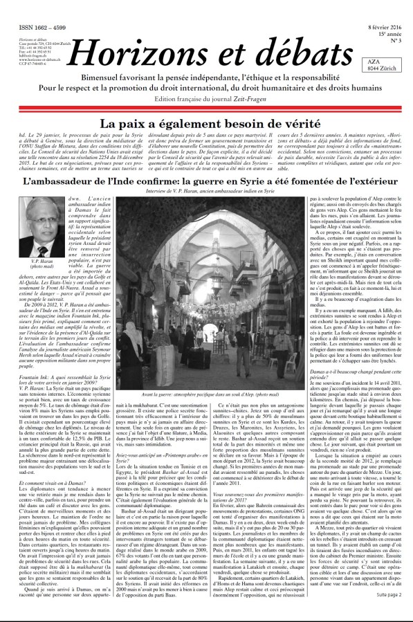 L’ex-ambassadeur indien en Syrie : La guerre en Syrie a été fomentée de l’extérieur – Horizons et Débats, 8 février 2016