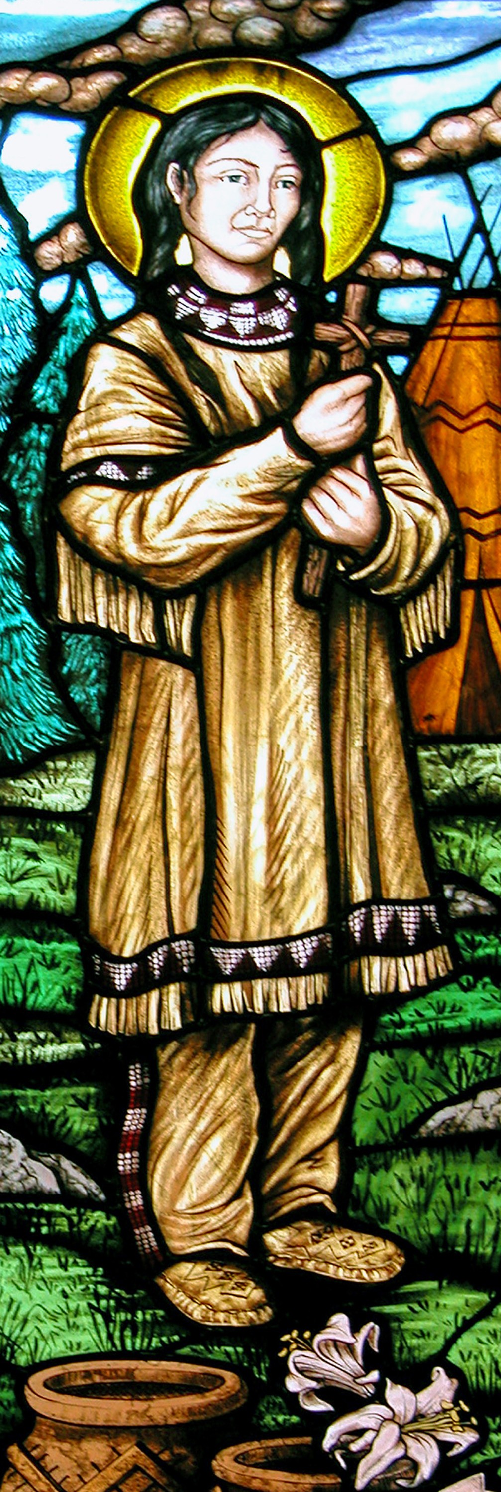 Kateri Tekakwitha. Née en 1656 dans le village de Ossernenon, dans ce qui est aujourd’hui l’État de New York, elle a vécu la majeure partie de sa vie dans cette partie de la Nouvelle France qui s’appelle aujourd’hui le Québec. Sa dépouille repose depuis le 17 avril 1680 à Kahnawake , au sud de ce qui s’appelait jadis Hochelaga, puis Ville Marie, et qui est aujourd’hui mieux connu sous le nom de “Montréal” , au Québec, où se trouvent les terres les plus fertiles du territoire et qu’on a consciencieusement recouvert de béton et d’asphalte stériles, en asséchant, au passage, toutes les rivières. “Kateri”, c’est un diminutif de “Catherine” … “Tekakwitha” : “celle qui avance lentement”. Pas énervée, quoi. Illustration : Fragment d’un vitrail de la Chapelle du Centre Newman de l’ Université de Toronto.